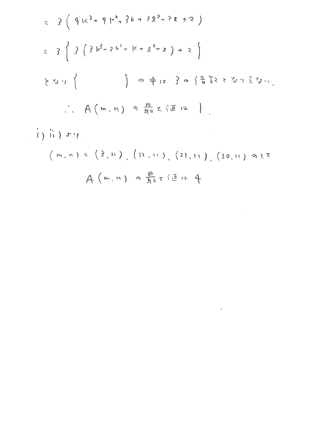 2020年 京都大学 理系数学 第1問/ 第2問/ 第3問/第4問/ 第5問/ 第6問 <解説> 京都大では恒例の整数問題です。例年は条件がシンプルで何から手を付けようかと悩まされる問題が多いのに対して、今回は条件が多くてどうしたらいいか別の意味で悩まされる問題です。 「3で割り切れない」というキーワードがあるので、mとnの条件設定を ・3で割り切れる ・3で割って1余る ・3で割って2余るにすることで、解答作成を進めていきます。その他の条件に合致するように全て検証する必要があります。 <解答> 入試解答ページTOPへ HOME | 2020京都大理系数学4