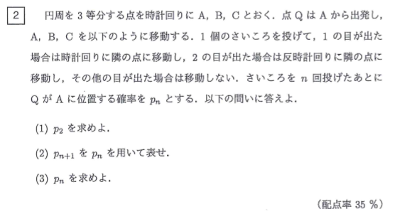 サイコロを使った確率と漸化式の融合問題です。この手の問題に慣れている人であれば、標準的な問題だと思われます。確実に解き切ってください。